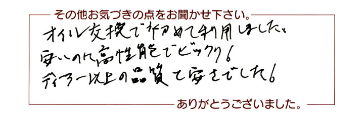 オイル交換で初めて利用しました。安いのに高性能でビックリ!ディーラー以上の品質と安さでした!青梅市 K.Y.さま