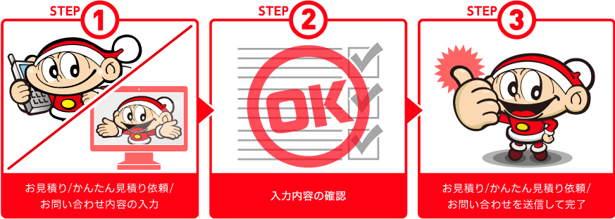 お電話もしくはフォームからお見積り・かんたん見積り依頼・お問い合わせ頂けます。後ほど担当者が対応させて頂きます。